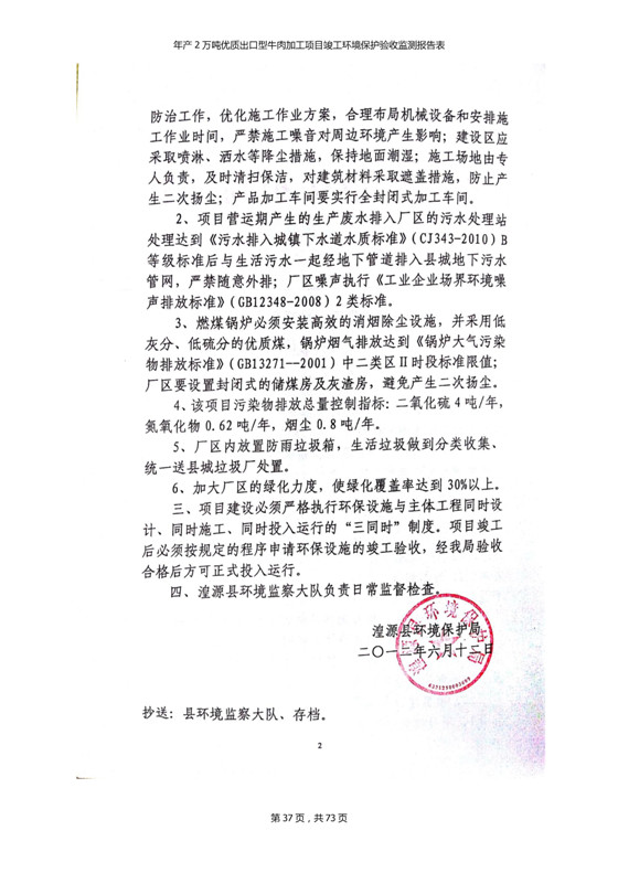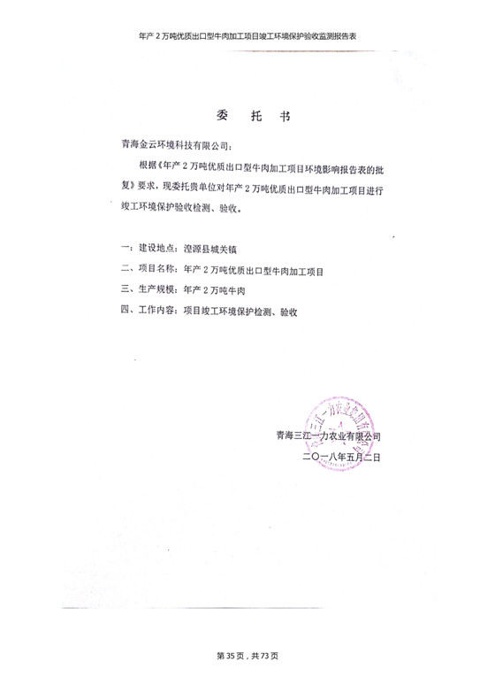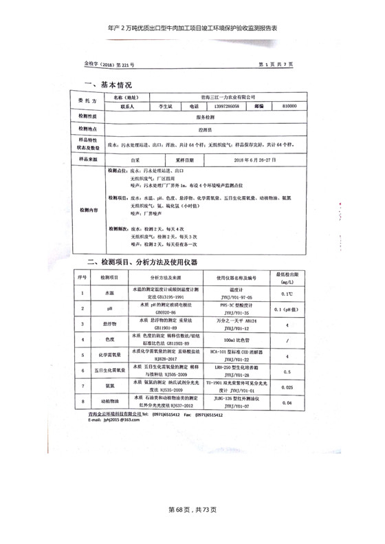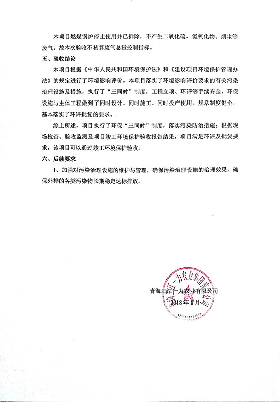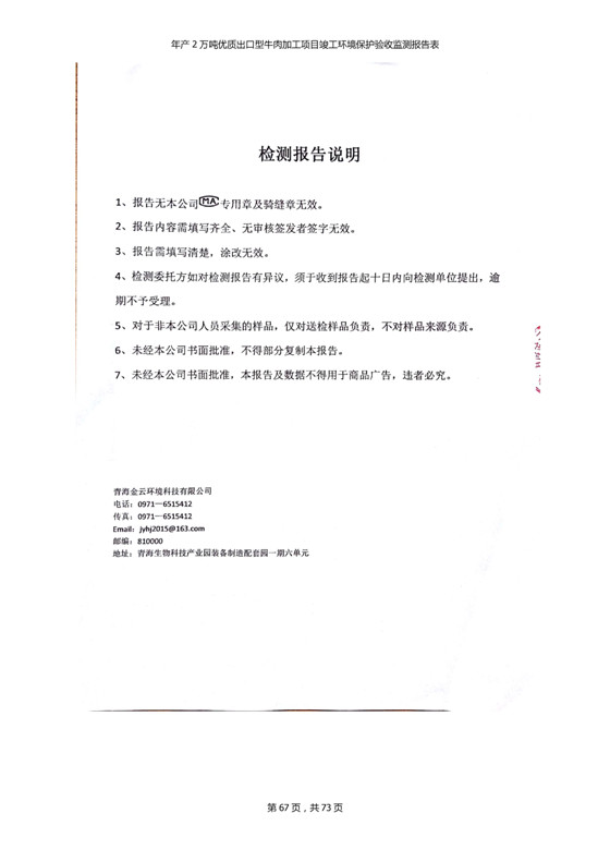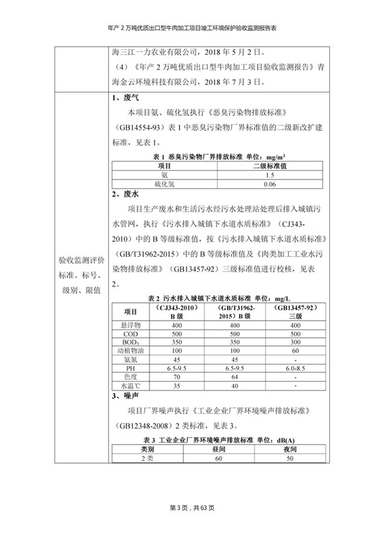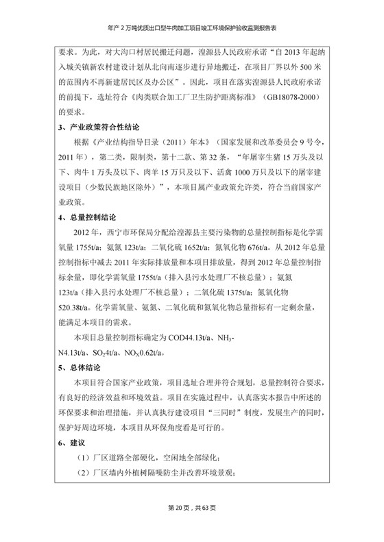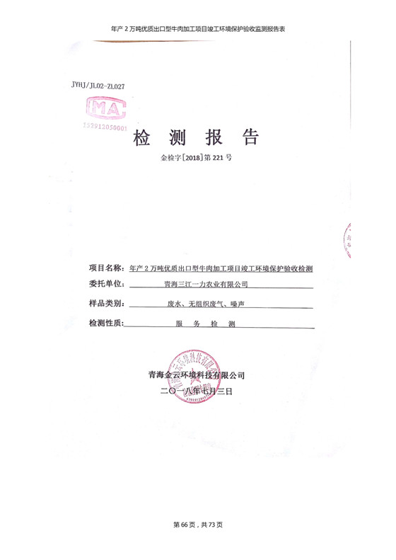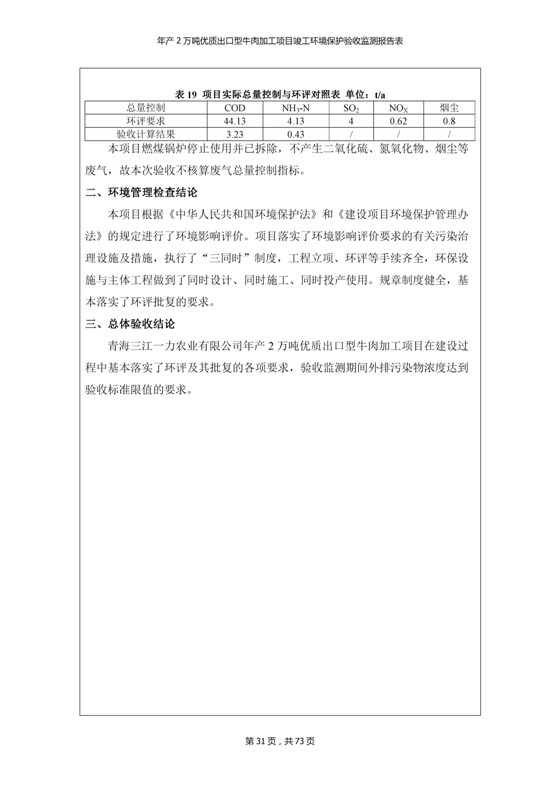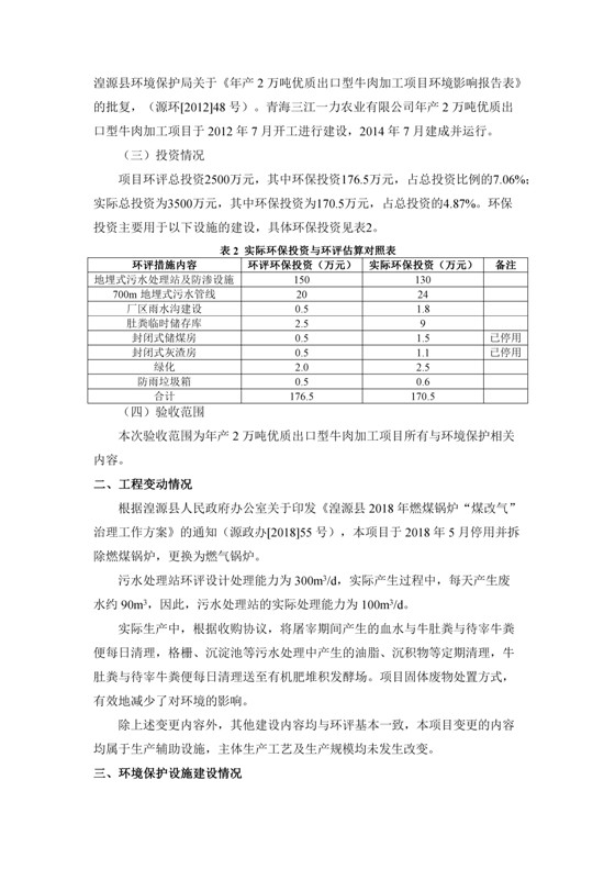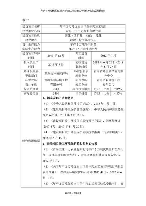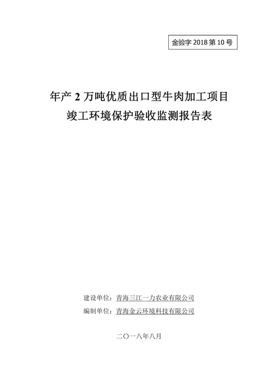根據(jù)中華人民共和國國務(wù)院令第253號《建設(shè)項目環(huán)境保護管理條例》(中華人民共和國國務(wù)院令第682號《國務(wù)院關(guān)于修改〈建設(shè)項目環(huán)境保護管理條例〉的決定》和《建設(shè)項目竣工環(huán)境保護驗收暫行辦法》,嚴(yán)格依照有關(guān)法律法規(guī),建設(shè)項目環(huán)境保護設(shè)施驗收技術(shù)規(guī)范,本項目環(huán)評報告表和環(huán)保審批部門審批意見以及企業(yè)自行驗收相關(guān)要求等對本項目進行驗收,本項目符合環(huán)保驗收條件,可以通過環(huán)保驗收。 青海三江一力農(nóng)業(yè)有限公司組織召開年產(chǎn)2萬噸優(yōu)質(zhì)出口型牛肉加工項目(一期工程)驗收組意見.