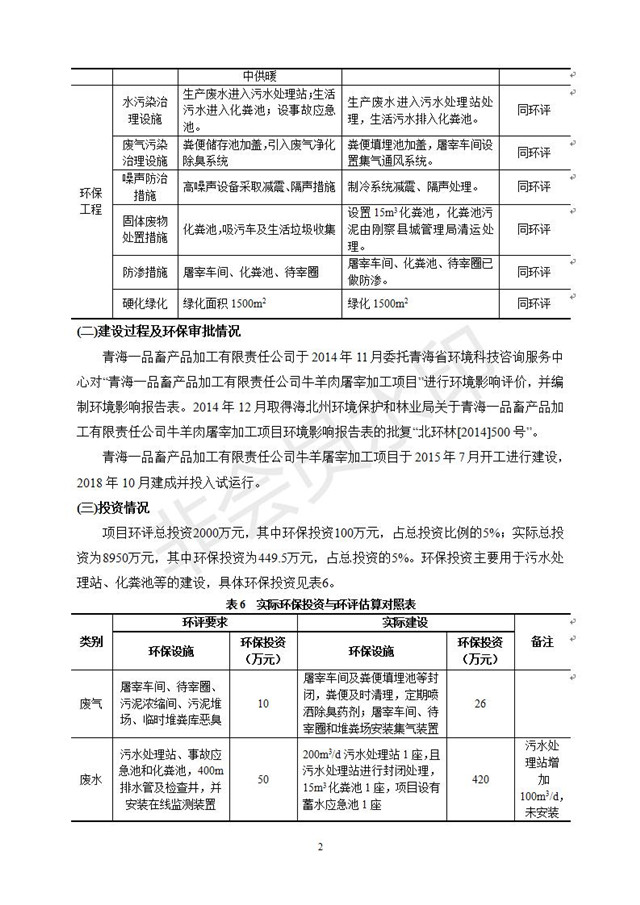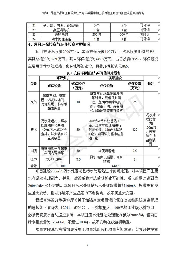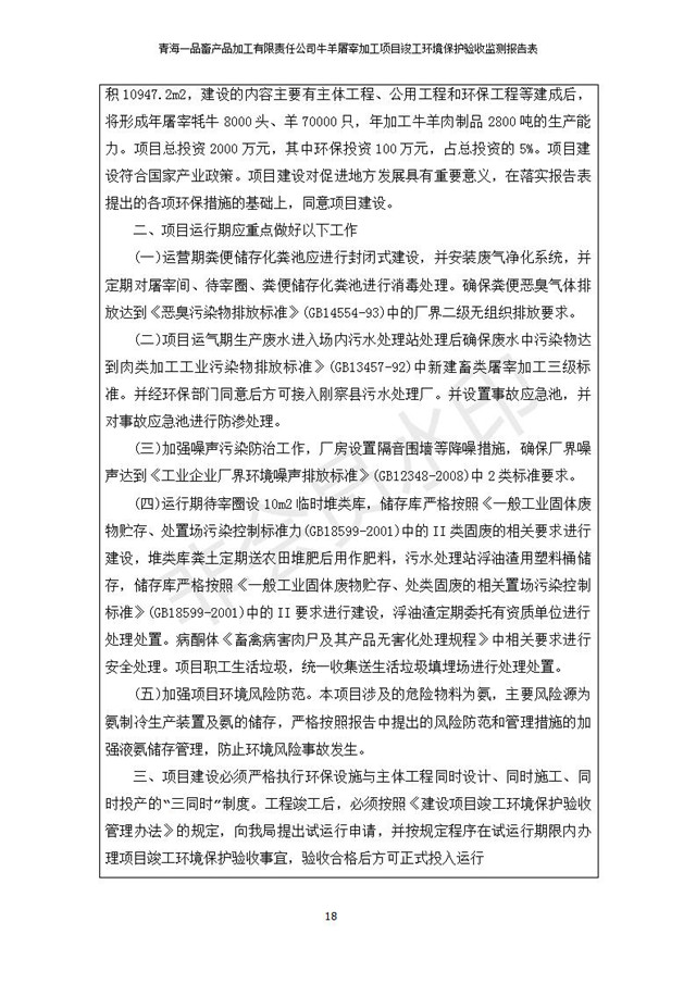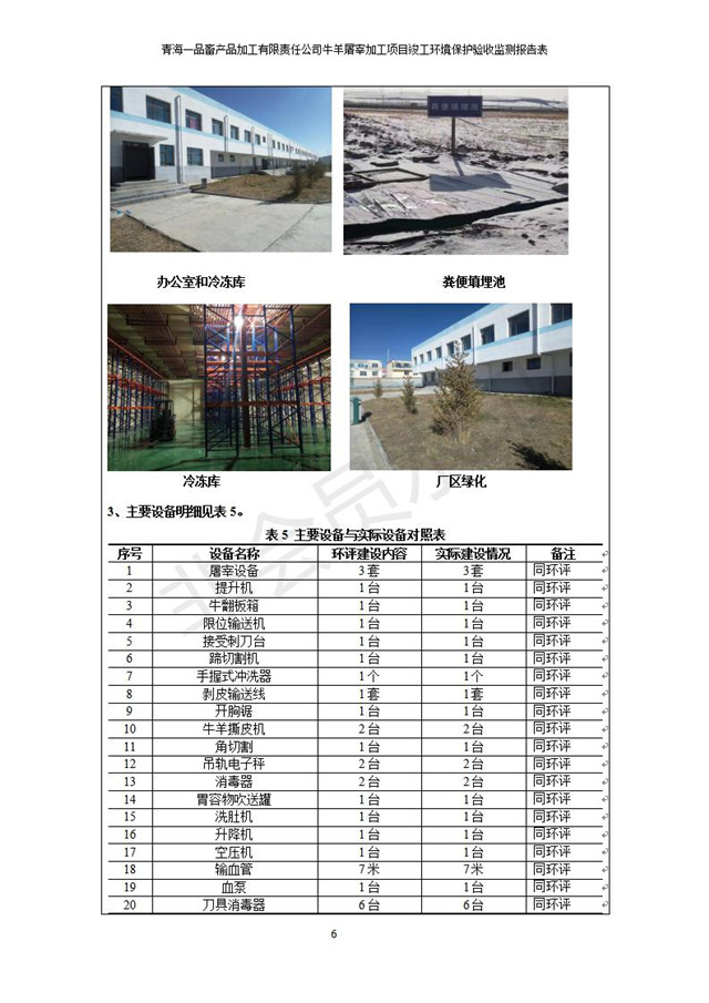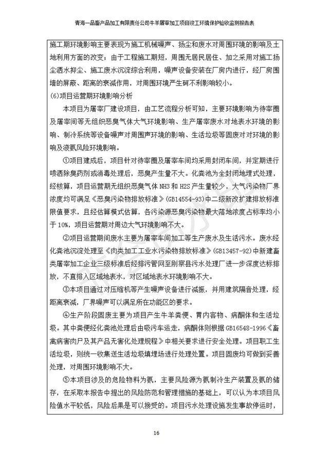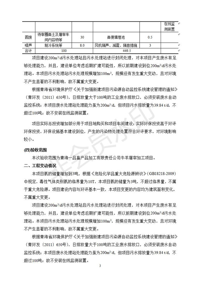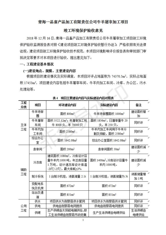 根據(jù)中華人民共和國(guó)國(guó)務(wù)院令第682號(hào)《國(guó)務(wù)院關(guān)于修改〈建設(shè)項(xiàng)目環(huán)境保護(hù)管理?xiàng)l例〉的決定》和《建設(shè)項(xiàng)目竣工環(huán)境保護(hù)驗(yàn)收暫行辦法》(國(guó)務(wù)院令682號(hào)),青海一品畜產(chǎn)品加工有限責(zé)任公司牛羊屠宰加工項(xiàng)目(包括竣工環(huán)境保護(hù)驗(yàn)收監(jiān)測(cè)報(bào)告表和驗(yàn)收意見)公示如下。 一、項(xiàng)目名稱:青海一品畜產(chǎn)品加工有限責(zé)任公司牛羊屠宰加工項(xiàng)目竣工環(huán)境保護(hù)驗(yàn)收監(jiān)測(cè)報(bào)告表 二、地點(diǎn):剛察縣縣城東大街加油站東側(cè) 三、建設(shè)單位:青海一品畜產(chǎn)品加工有限責(zé)任公司 四、建設(shè)內(nèi)容:項(xiàng)目地面積17453m2,項(xiàng)目建設(shè)內(nèi)容包括牛羊屠宰車間、牛羊肉加工車間、冷庫(kù)、辦公區(qū)、污水處理站等。 五、聯(lián)系人:張工 七、公示時(shí)間:二〇一九年一月十一日至二〇一九年二月七日 公示期間,對(duì)上述公示內(nèi)容如有異議,請(qǐng)以書面形式反饋,個(gè)人須署真實(shí)姓名,單位須加蓋公章。
