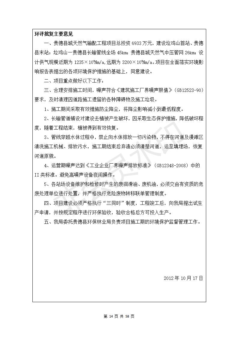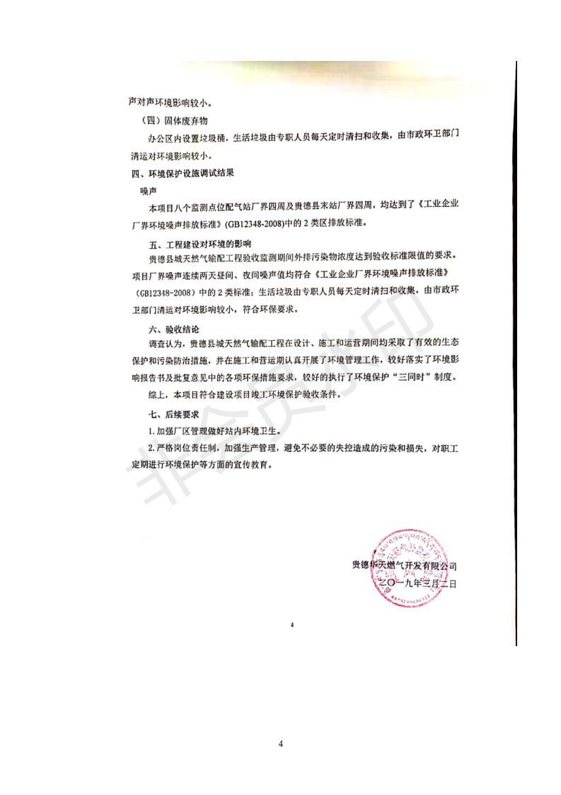 根據(jù)中華人民共和國(guó)務(wù)院令第682號(hào)《國(guó)務(wù)院關(guān)于修改〈建設(shè)項(xiàng)目環(huán)境保護(hù)管理?xiàng)l例〉的決定》和《建設(shè)項(xiàng)目竣工環(huán)境保護(hù)驗(yàn)收暫行辦法》(國(guó)務(wù)院令682號(hào)),貴德縣城輸配管線(xiàn)工程竣工環(huán)境保護(hù)驗(yàn)收內(nèi)容(包括竣工環(huán)境保護(hù)驗(yàn)收調(diào)查表和驗(yàn)收意見(jiàn))公示如下。 一、項(xiàng)目名稱(chēng):貴德縣城天然氣輸配工程 二、地點(diǎn):拉雞蓋澀寧蘭復(fù)線(xiàn)22#閥室-貴德縣城 三、建設(shè)單位:貴德華天燃?xì)忾_(kāi)發(fā)有限公司 四、建設(shè)內(nèi)容:貴德縣末站、貴德縣配氣站、貴德縣中壓管網(wǎng)、拉雞蓋22#閥室-貴德縣城長(zhǎng)輸管線(xiàn) 五、公示時(shí)間:二〇一九年三月十一日至二〇一九年四月八日 六、聯(lián)系人:張工 公示期間,對(duì)上述公示內(nèi)容如有異議,請(qǐng)以書(shū)面形式反饋,個(gè)人須署真實(shí)姓名,單位須加蓋公章。