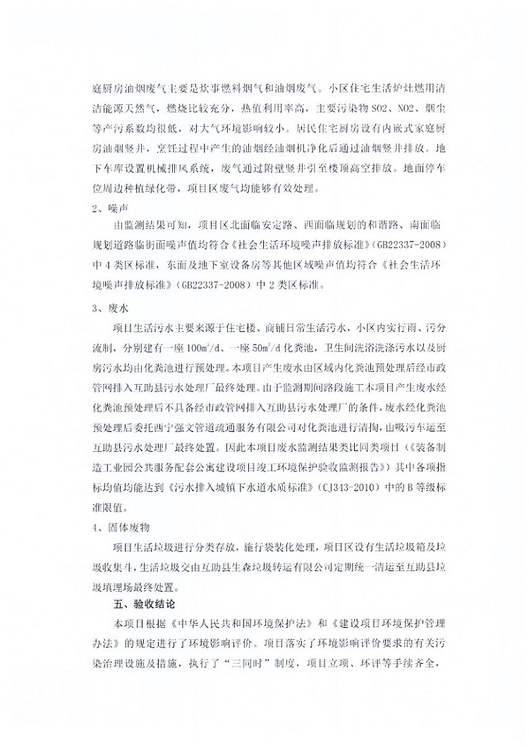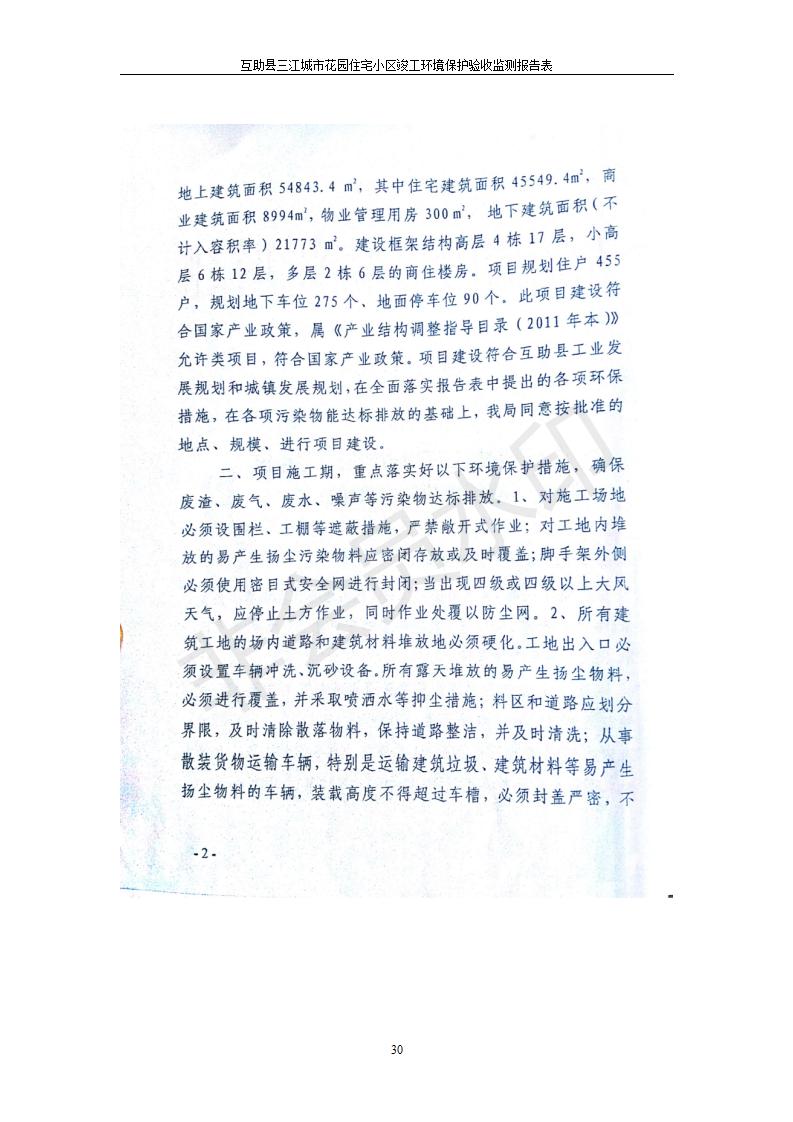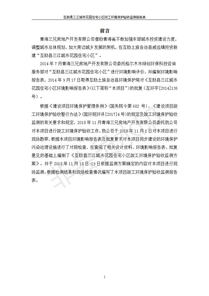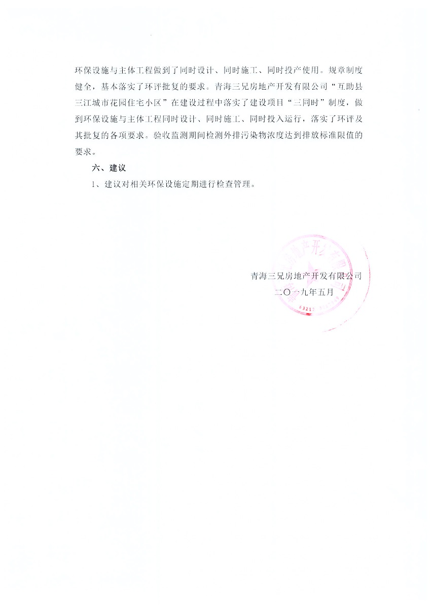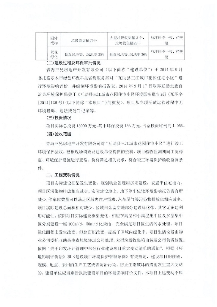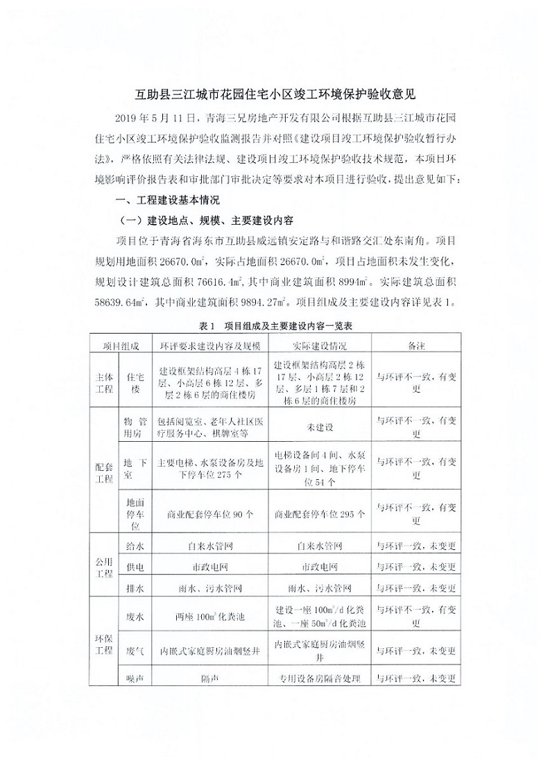 根據(jù)中華人民共和國(guó)國(guó)務(wù)院令第682號(hào)《國(guó)務(wù)院關(guān)于修改〈建設(shè)項(xiàng)目環(huán)境保護(hù)管理?xiàng)l例〉的決定》和《建設(shè)項(xiàng)目竣工環(huán)境保護(hù)驗(yàn)收暫行辦法》(國(guó)務(wù)院令682號(hào)),互助縣三江城市花園住宅小區(qū)(包括竣工環(huán)境保護(hù)驗(yàn)收監(jiān)測(cè)報(bào)告表和驗(yàn)收意見)公示如下。 一、項(xiàng)目名稱: 互助縣三江城市花園住宅小區(qū)竣工環(huán)境保護(hù)驗(yàn)收監(jiān)測(cè)報(bào)告表 二、地點(diǎn):青海省海東市互助土族自治縣威遠(yuǎn)鎮(zhèn)安定路與和諧路交匯處東南角 三、建設(shè)單位:青海三兄房地產(chǎn)開發(fā)有限公司 四、建設(shè)內(nèi)容:項(xiàng)目規(guī)劃用地面積26670.0m2,實(shí)際占地面積26670.0m2,項(xiàng)目占地面積未發(fā)生變化,規(guī)劃設(shè)計(jì)建筑總面積76616.4m2,其中商業(yè)建筑面積8994m2。實(shí)際建筑總面積58639.64m2,其中商業(yè)建筑面積9894.27m2。 五、聯(lián)系人:張工 六、聯(lián)系電 話:0971-6515411 七、公示時(shí)間:二〇一九年六月五日至二〇一九年七月三日 公示期間,對(duì)上述公示內(nèi)容如有異議,請(qǐng)以書面形式反饋,個(gè)人須署真實(shí)姓名,單位須加蓋公章。