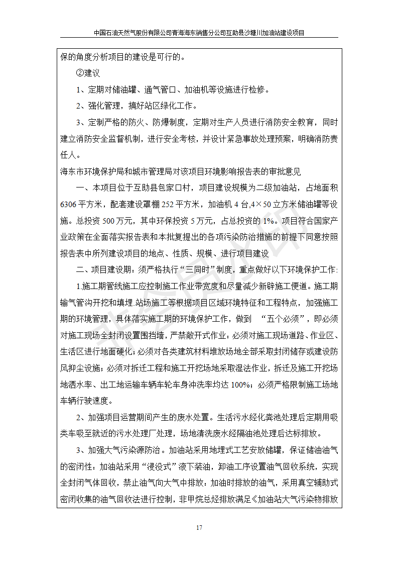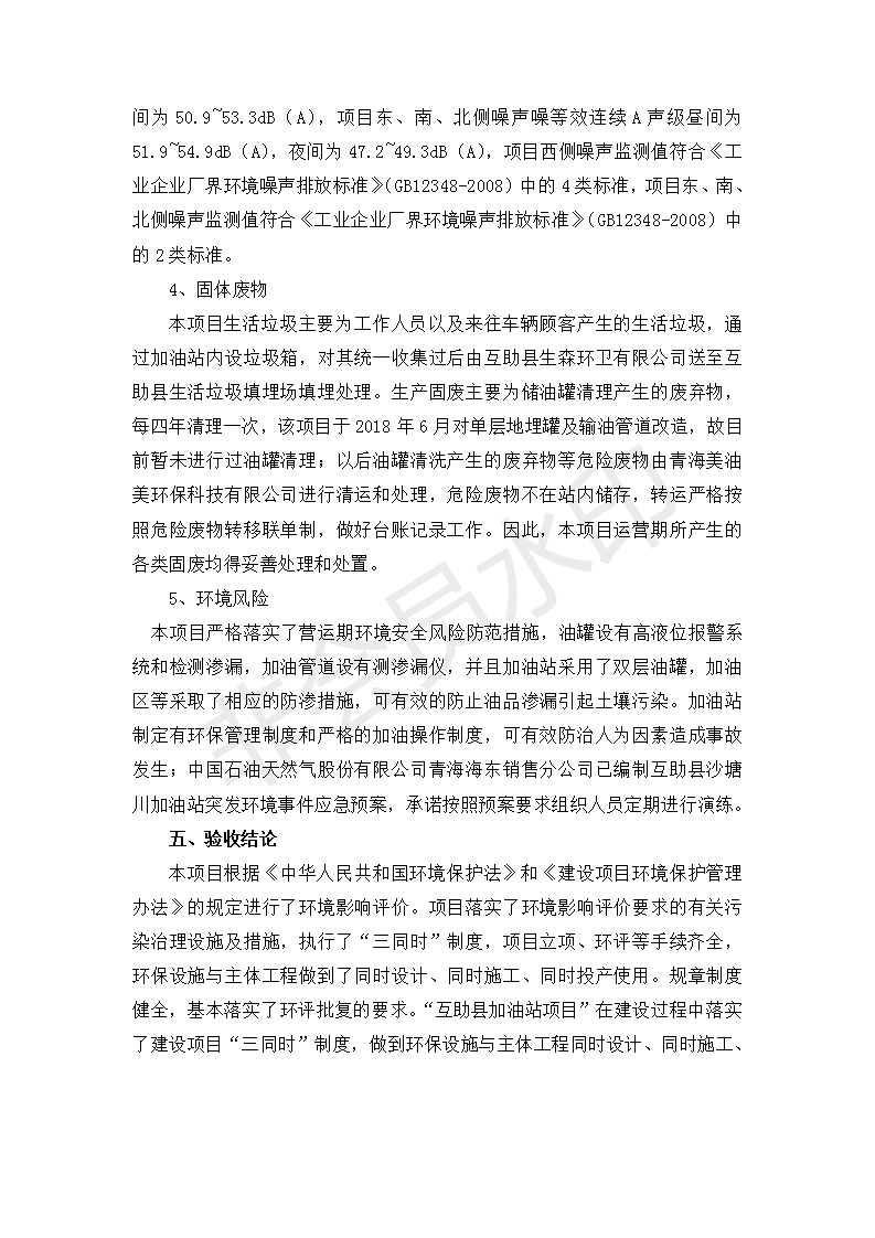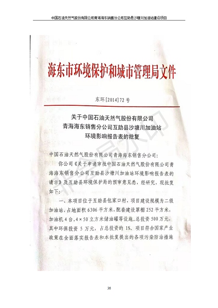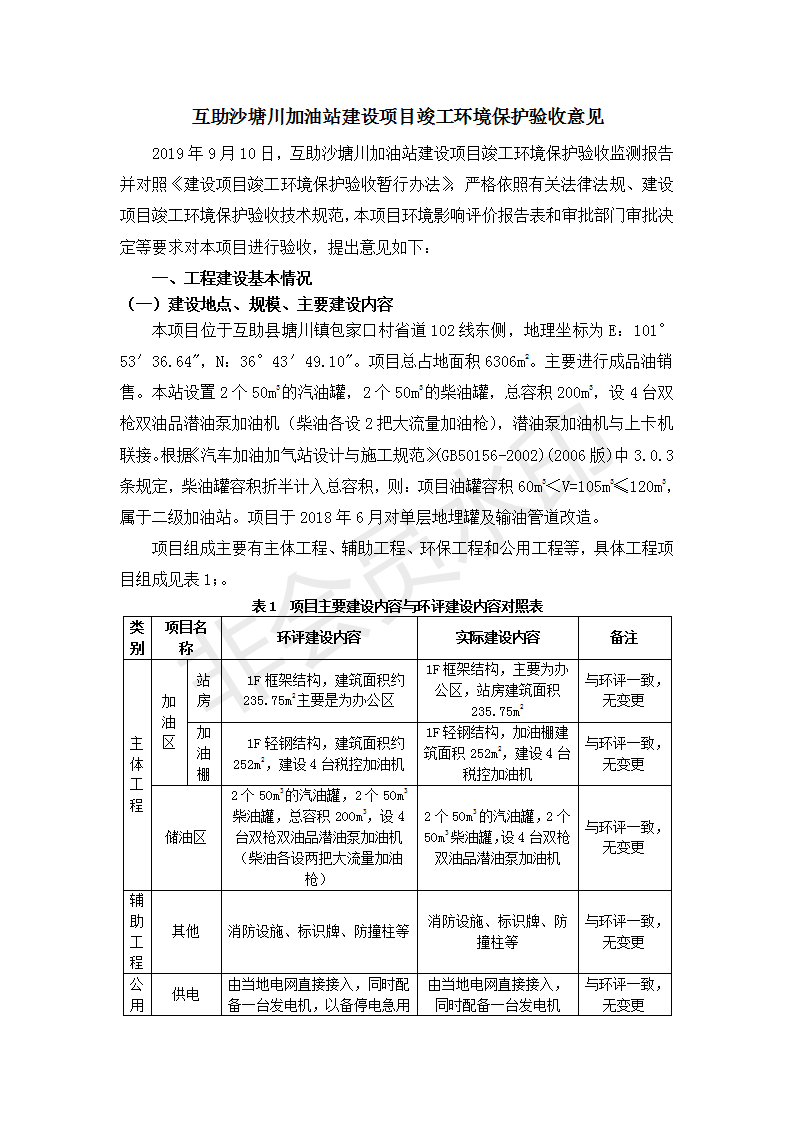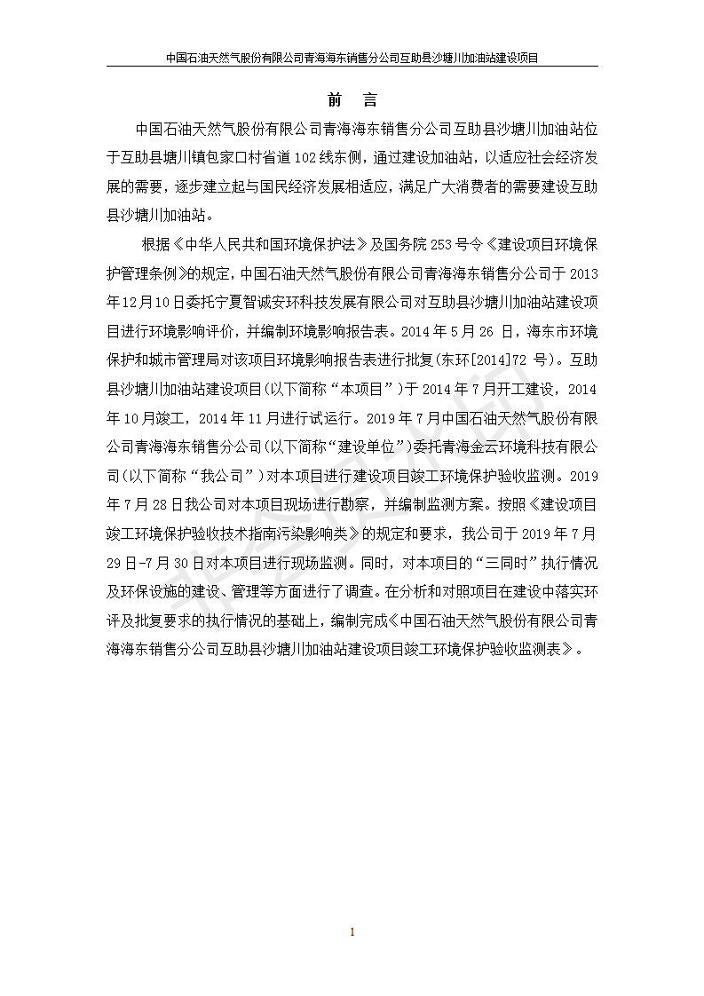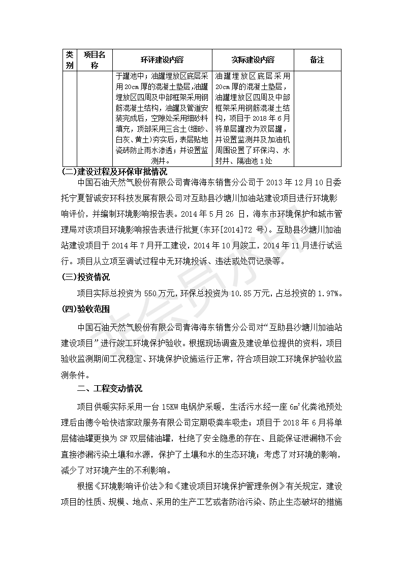 根據(jù)中華人民共和國國務(wù)院令第682號《國務(wù)院關(guān)于修改〈建設(shè)項目環(huán)境保護管理條例〉的決定》和《建設(shè)項目竣工環(huán)境保護驗收暫行辦法》(國務(wù)院令682號),互助縣沙塘川加油站建設(shè)項目(包括竣工環(huán)境保護驗收監(jiān)測報告表和驗收意見)公示如下。 一、項目名稱:互助縣沙塘川加油站建設(shè)項目 二、地點:互助縣塘川鎮(zhèn)包家口村 六、聯(lián)系電話:0971-6515411 七、公示時間:二〇一九年九月二十七日至二〇一九年十月二十九日 公示期間,對上述公示內(nèi)容如有異議,請以書面形式反饋,個人須署真實姓名,單位須加蓋公章。