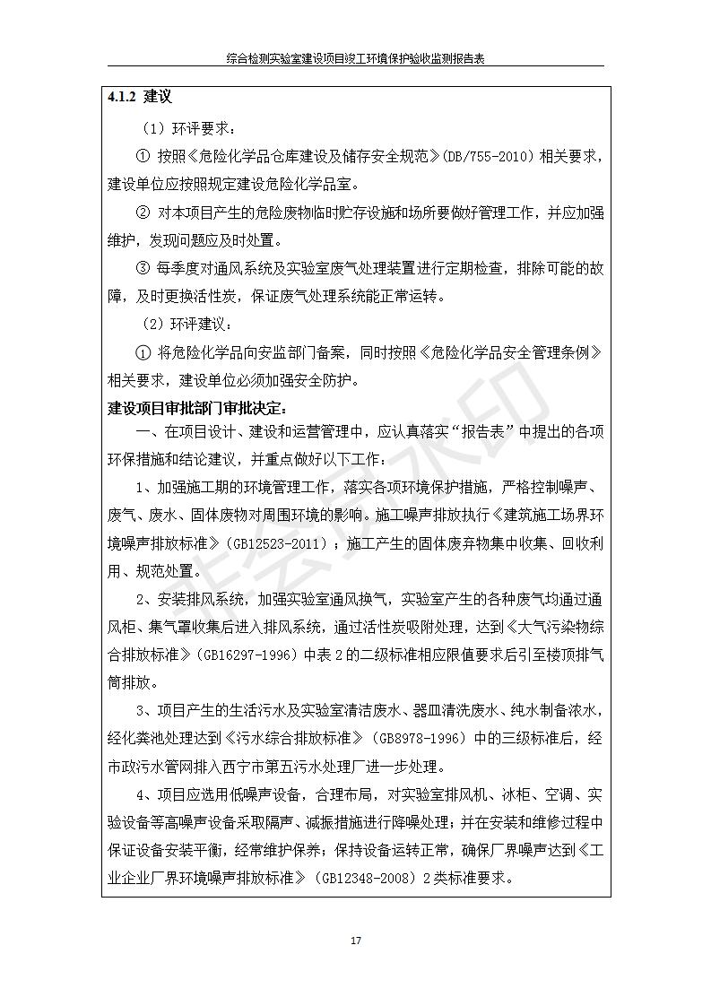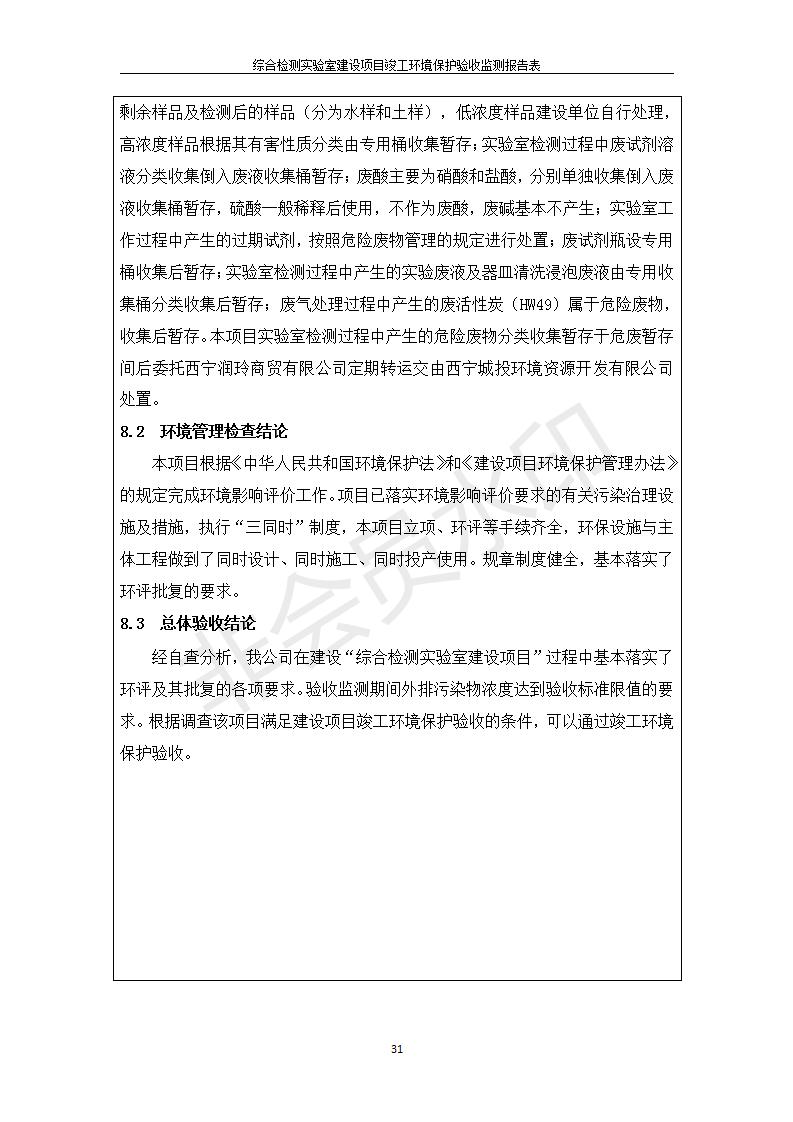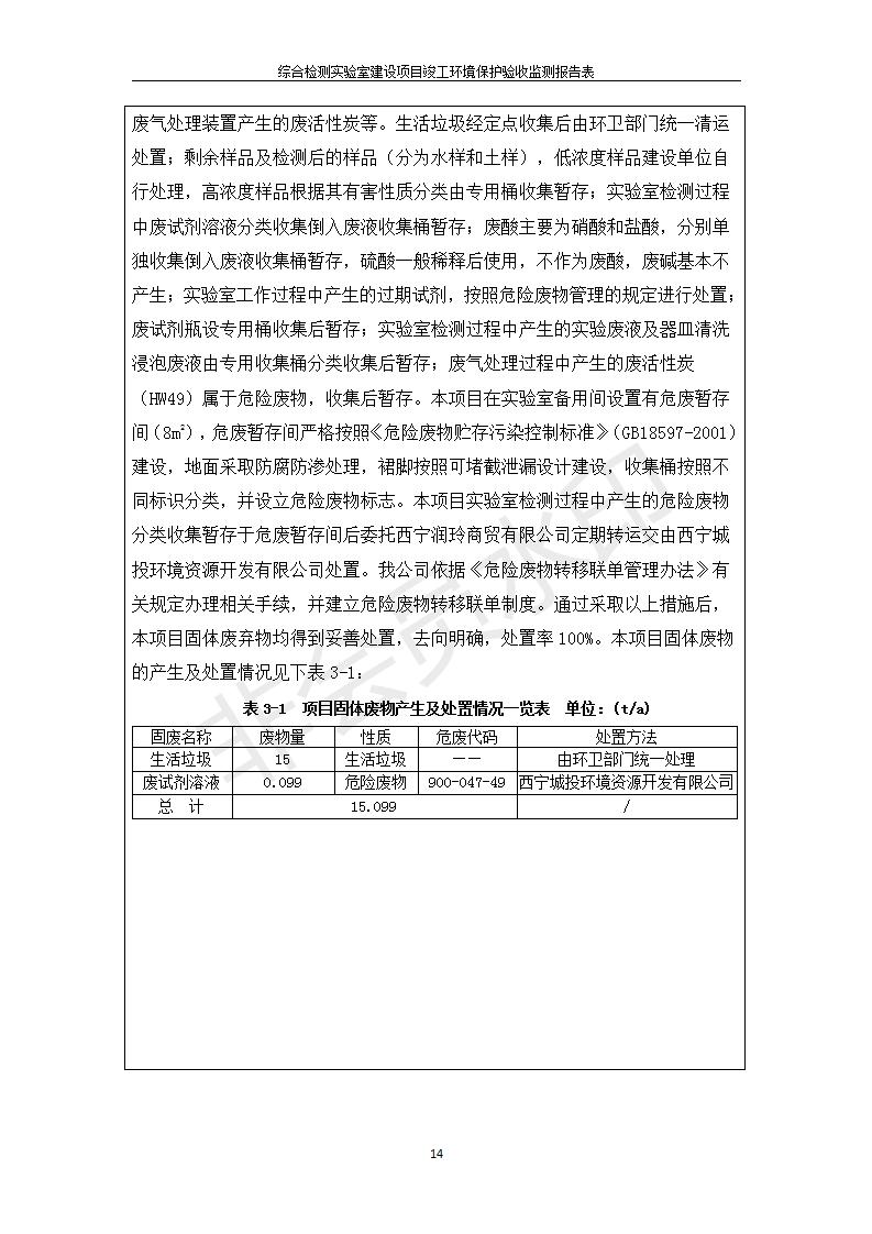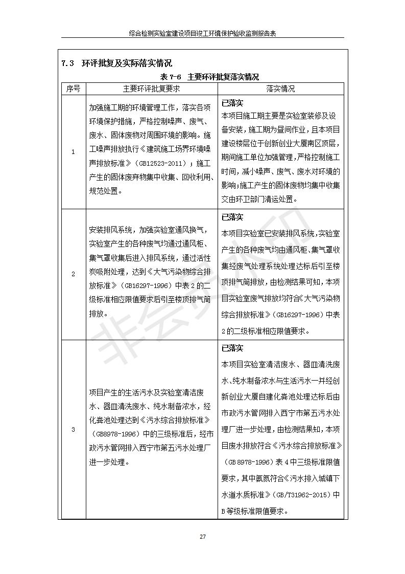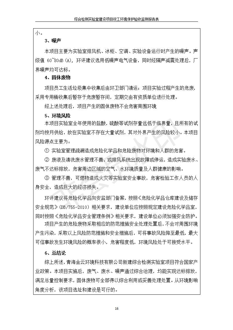 根據(jù)中華人民共和國國務(wù)院令第682號《國務(wù)院關(guān)于修改〈建設(shè)項目環(huán)境保護(hù)管理條例〉的決定》和《建設(shè)項目竣工環(huán)境保護(hù)驗收暫行辦法》(國務(wù)院令682號),綜合檢測實驗室建設(shè)項目(包括竣工環(huán)境保護(hù)驗收監(jiān)測報告表和驗收意見)公示如下。 一、項目名稱:綜合檢測實驗室建設(shè)項目 二、地點:西寧市經(jīng)濟技術(shù)開發(fā)區(qū)生物科技產(chǎn)業(yè)園區(qū)創(chuàng)新創(chuàng)業(yè)大廈南區(qū)15、16層 六、聯(lián)系電話:0971-6515411 七、公示時間:二〇一九年十一月十九日至二〇一九年十二月十六日 公示期間,對上述公示內(nèi)容如有異議,請以書面形式反饋,個人須署真實姓名,單位須加蓋公章。