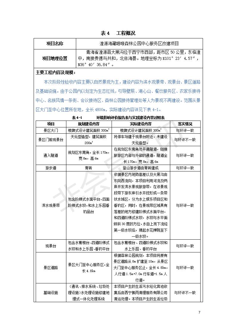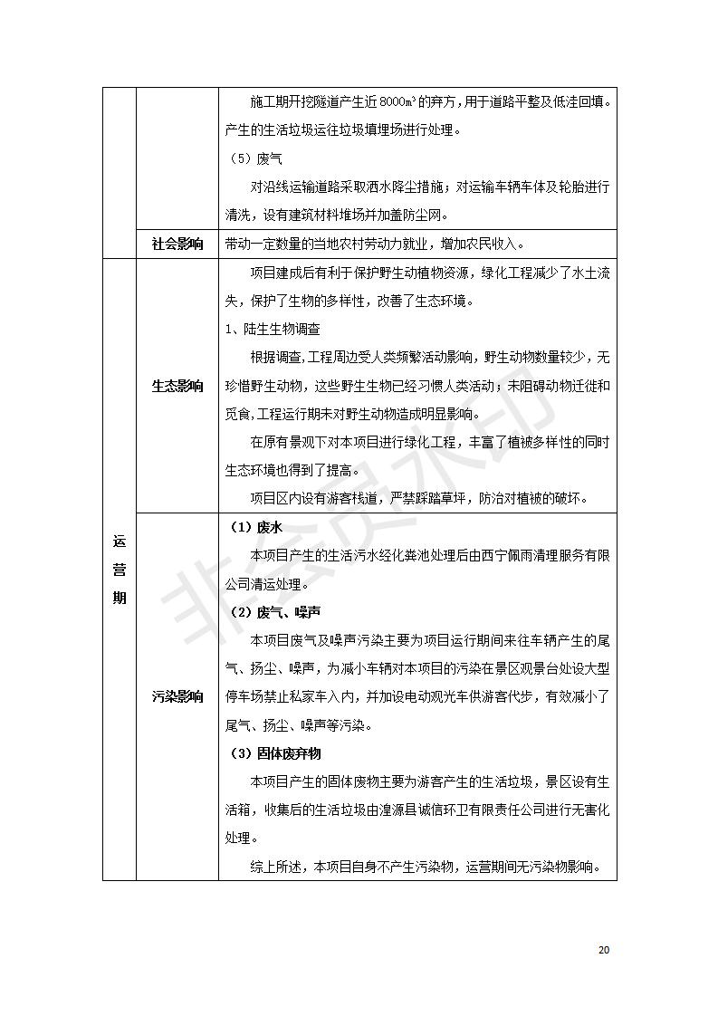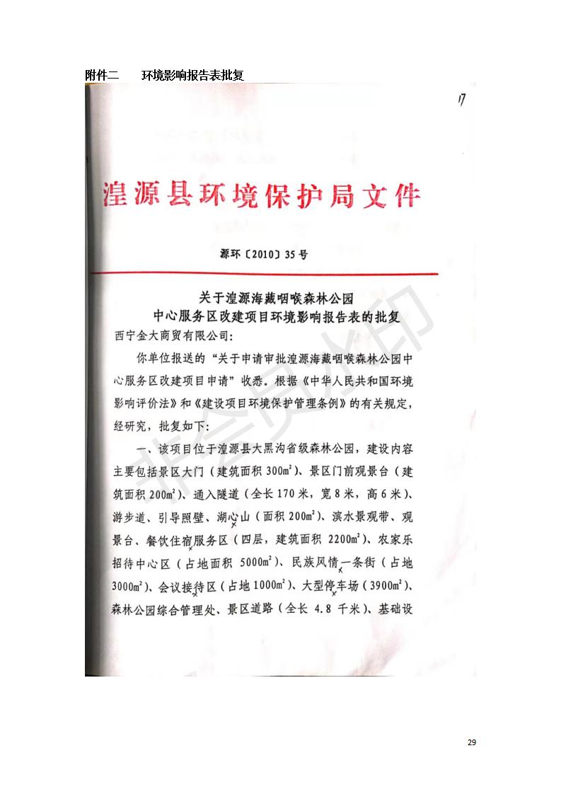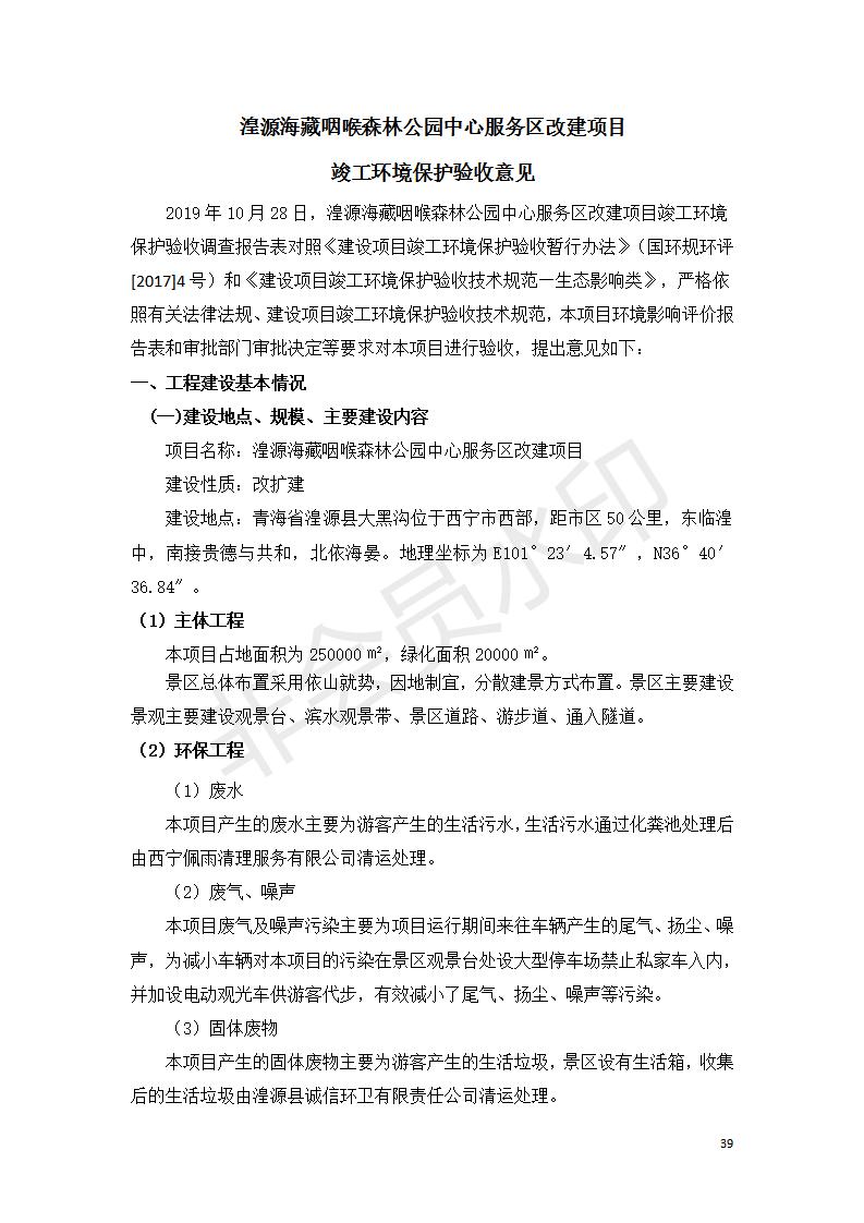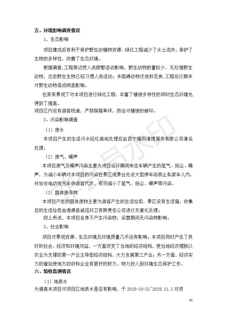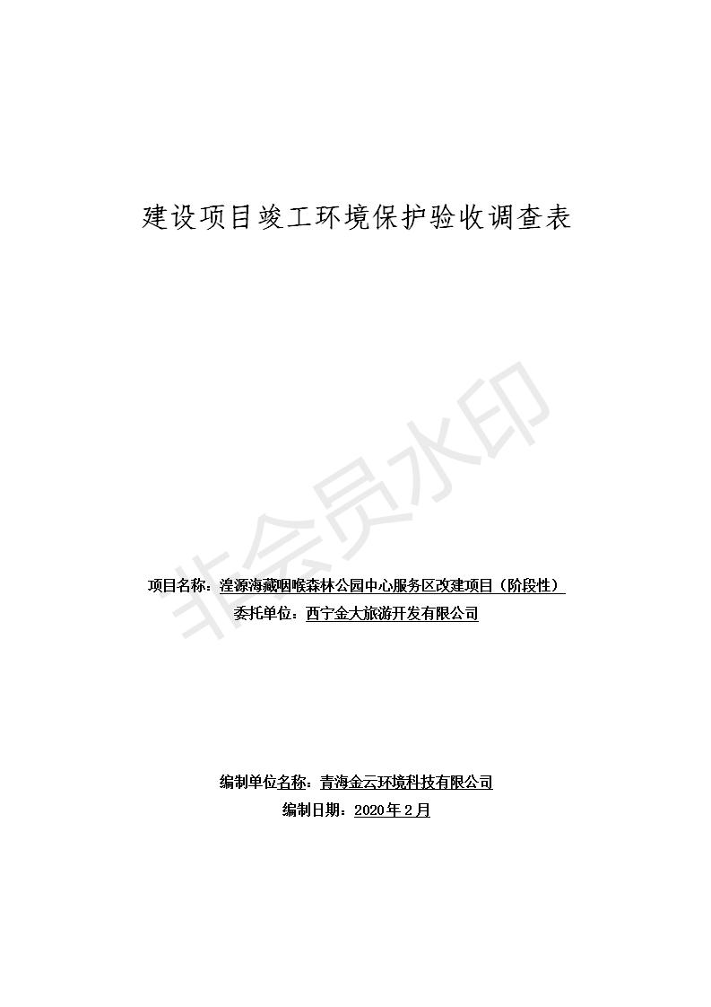 根據(jù)中華人民共和國國務院令第682號《國務院關(guān)于修改〈建設(shè)項目環(huán)境保護管理條例〉的決定》和《建設(shè)項目竣工環(huán)境保護驗收暫行辦法》(國務院令682號),湟源海藏咽喉森林公園中心服務區(qū)改建項目(階段性),(包括竣工環(huán)境保護驗收調(diào)查表和驗收意見)公示如下。 一、項目名稱:湟源海藏咽喉森林公園中心服務區(qū)改建項目(階段性) 竣工環(huán)境保護驗收調(diào)查表 二、地點:青海省湟源縣東峽鄉(xiāng)大黑溝 三、建設(shè)單位:西寧金大旅游開發(fā)有限公司 四、建設(shè)內(nèi)容:本次階段性驗收以自然景觀為主,建設(shè)內(nèi)容為濱水景觀帶、觀景臺、景區(qū)道路及基礎(chǔ)設(shè)施。項目范圍從景區(qū)大門至中心位置,全長4800m。 五、聯(lián)系人:張工 六、聯(lián)系電 話:0971-6515411 七、公示時間:二〇二〇年四月二十九日至二〇二〇年五月二十八日 公示期間,對上述公示內(nèi)容如有異議,請以書面形式反饋,個人須署真實姓名,單位須加蓋公章。
