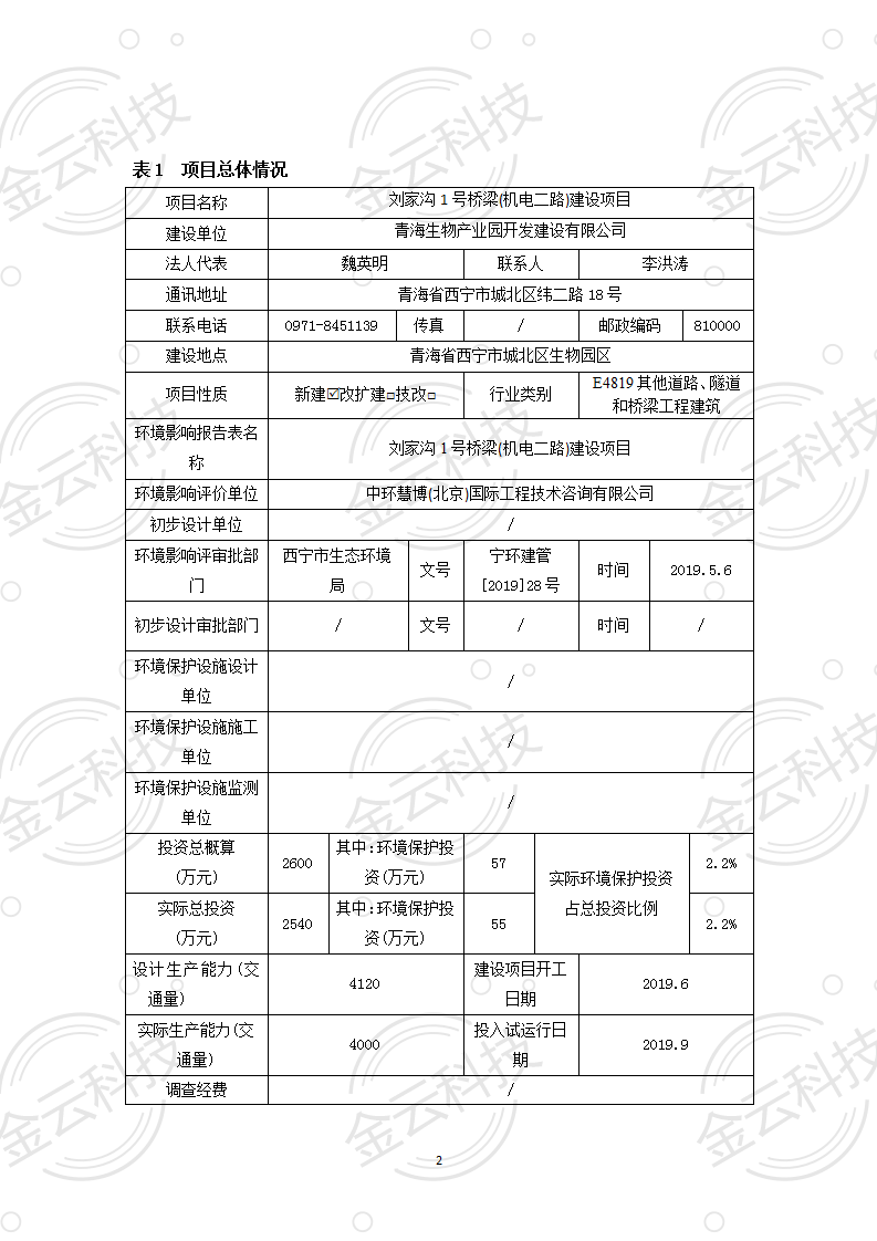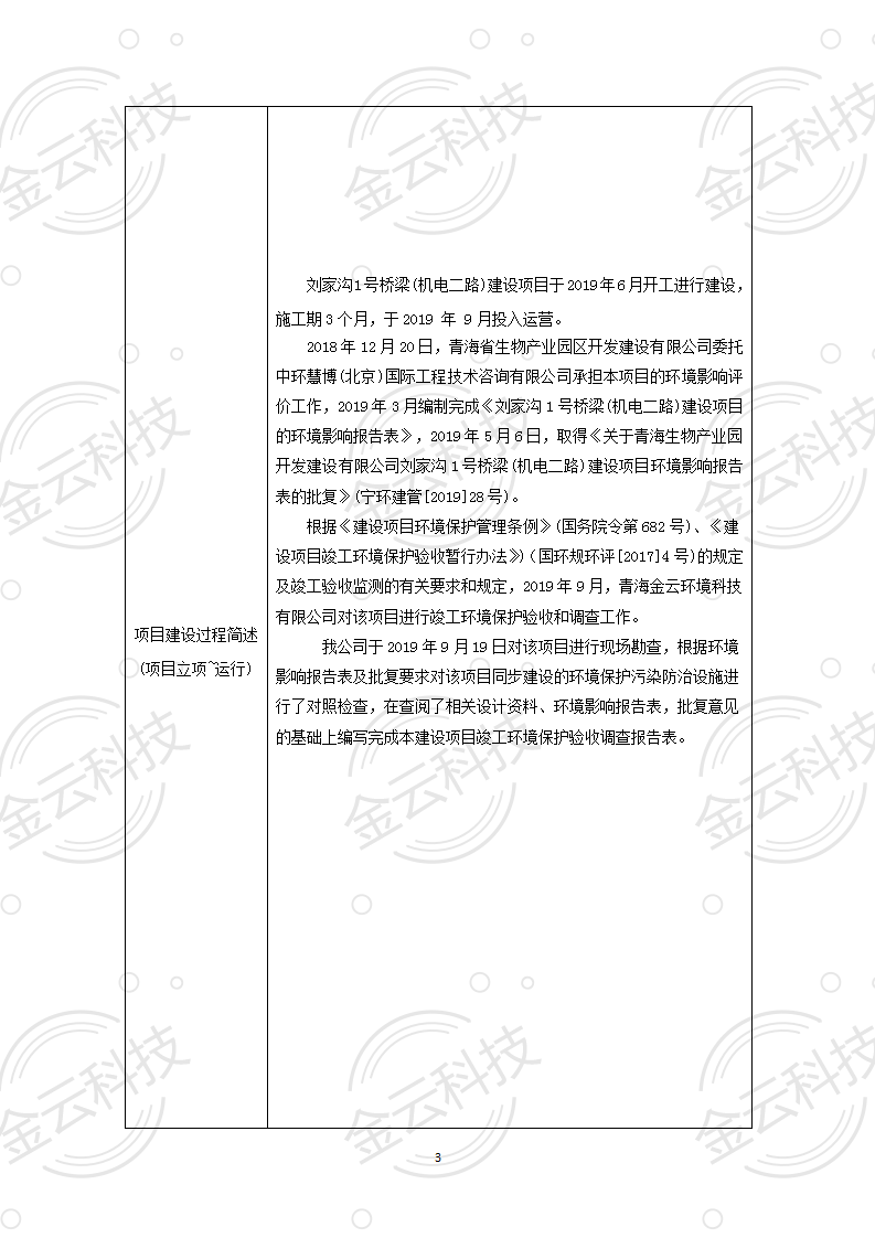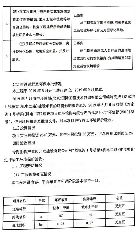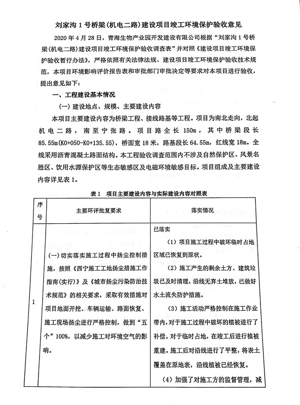 根據(jù)中華人民共和國國務院令第682號《國務院關于修改〈建設項目環(huán)境保護管理條例〉的決定》和《建設項目竣工環(huán)境保護驗收暫行辦法》(國務院令682號),劉家溝1號橋梁(機電二路)建設項目竣工環(huán)境保護驗收調(diào)查表,(包括竣工環(huán)境保護驗收調(diào)查表和驗收意見)公示如下。 一、項目名稱:劉家溝1號橋梁(機電二路)建設項目竣工環(huán)境保護驗收調(diào)查表 二、地點:青海省西寧市城北區(qū)生物園區(qū) 三、建設單位:青海生物產(chǎn)業(yè)園開發(fā)建設有限公司 四、建設內(nèi)容:本項目主要建設內(nèi)容為橋梁工程、接線路基等工程。項目南北走向,北起機電二路,南至寧張路,項目全長150m. 五、聯(lián)系人:張工 六、聯(lián)系電 話:0971-6515411 七、公示時間:二〇二〇年六月二日至二〇二〇年六月三十日 公示期間,對上述公示內(nèi)容如有異議,請以書面形式反饋,個人須署真實姓名,單位須加蓋公章。 |